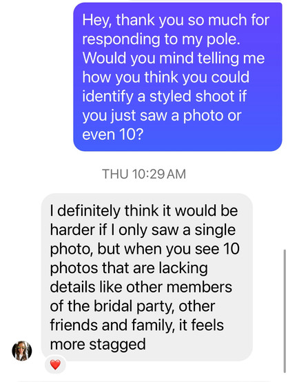 Social Media Smoke and Mirrors: Photographers think blending real weddings with styled shoots serves as social proof of their creative versatility. It's their way of casting a wide net to snag clients from all walks of life.